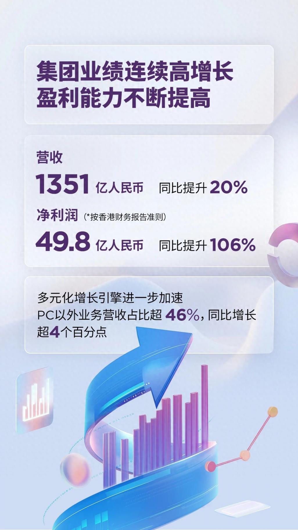 聯想集團營收1351億人民幣,同比增長20%,三大主營業務均實現雙位數增長。凈利潤同比增長106%至49.8億人民幣。