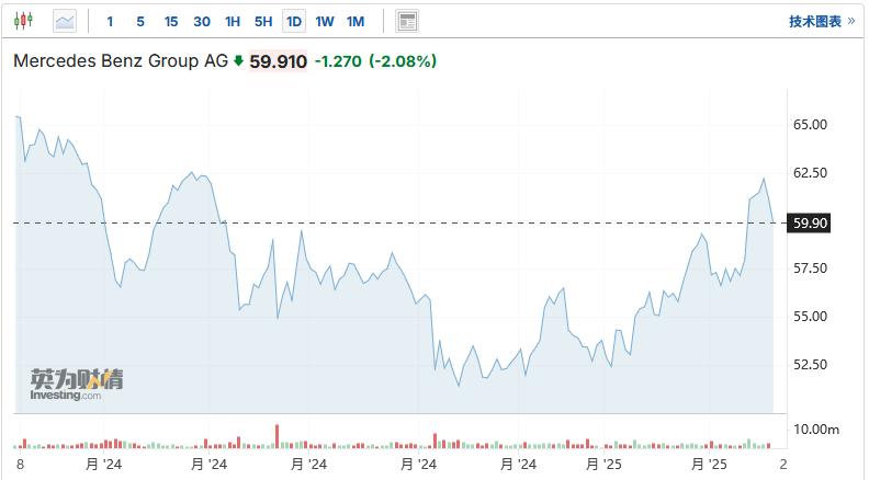 受業績不佳影響,截至發稿,梅賽德斯-奔馳在德國上市的股票跌超2%。