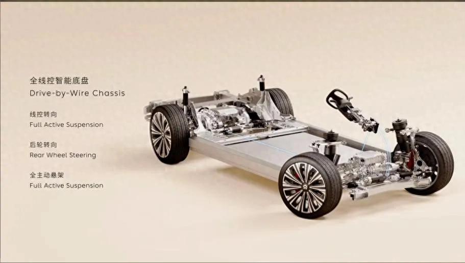 首先是集成度超高,它是現在全球唯一的全線控智能底盤,把線控轉向、后輪轉向和全主動懸架這三大核心硬件系統首次集成到一塊兒了。