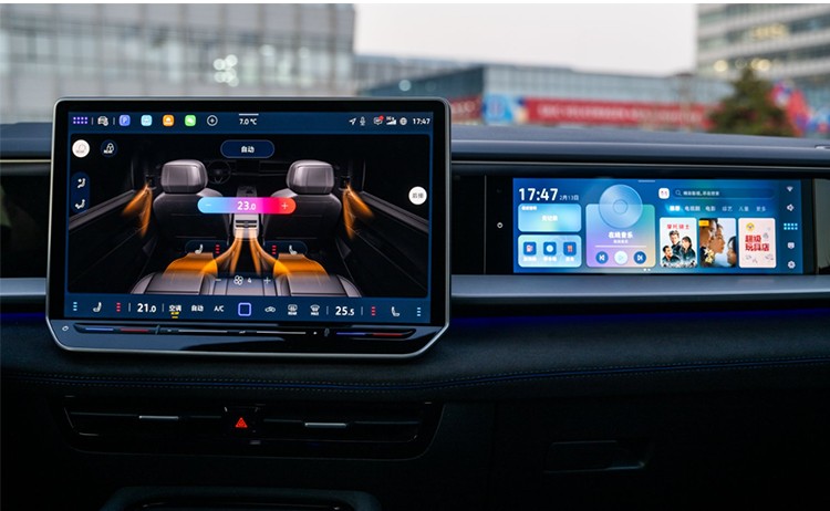 內飾部分采用大眾品牌最新的家族化設計,向全新途觀L Pro、帕薩特Pro看齊,中控臺上配備10.3英寸內嵌式液晶儀表盤、15英寸懸浮式中控屏、11.6英寸副駕駛娛樂屏,方向盤采用三輻式平底構造,使用電子懷擋式換擋機構,中央通道前方提供手機無線充電面板,后方為內置屏幕的旋鈕按鍵、縱向雙杯架。