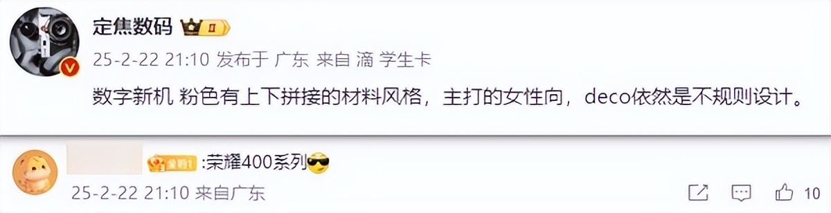 上述那位博主發文表示,數字新機的粉色版本采用的是上下拼接的材料風格,主要面向女性群體進行設計,其攝像頭模組依舊保持著不規則的設計樣式。綜合 “數字” 以及 “不規則攝像頭模組” 這些關鍵信息,基本能夠推斷出博主所提及的正是榮耀的數字系列,也就是最新的榮耀 400 系列了。就目前已有的榮耀 300 系列來說,其在配色方面已然十分豐富了,像廬煙紫和茶卡青等顏色都深受大家的喜愛,如果榮耀 400 系列新增粉色這一配色的話,預計將會吸引更多女性消費者的目光。