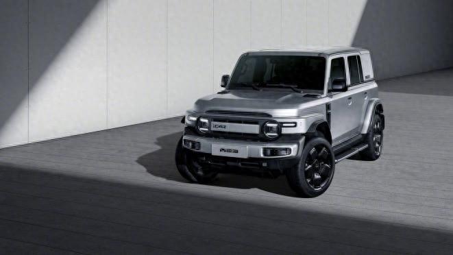 新車依舊采用方盒子造型,并且相比iCAR 03其外觀設計更為富有個性。前臉采用雙圓燈造型,周圍一圈黑色的橢圓輪廓。明顯致敬了經典的越野車型212,復古與新潮相結合。