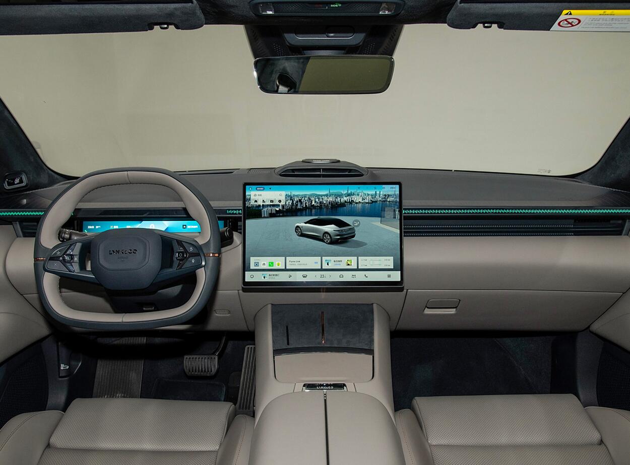 內部,有兩種配色可選。采用12.66英寸液晶儀表+15.4英寸中控屏+17英寸后排娛樂屏+25.6英寸抬頭顯示,同時配備了AMD V2000A桌面芯片和AMD RX6600M獨立顯卡,以及24g內存、1T固態硬盤、水冷扇熱,后排屏幕可以運行Windows辦公軟件。此外,還配備了真皮方向盤、50w無線充電、256色氛圍燈、熱泵空調等。