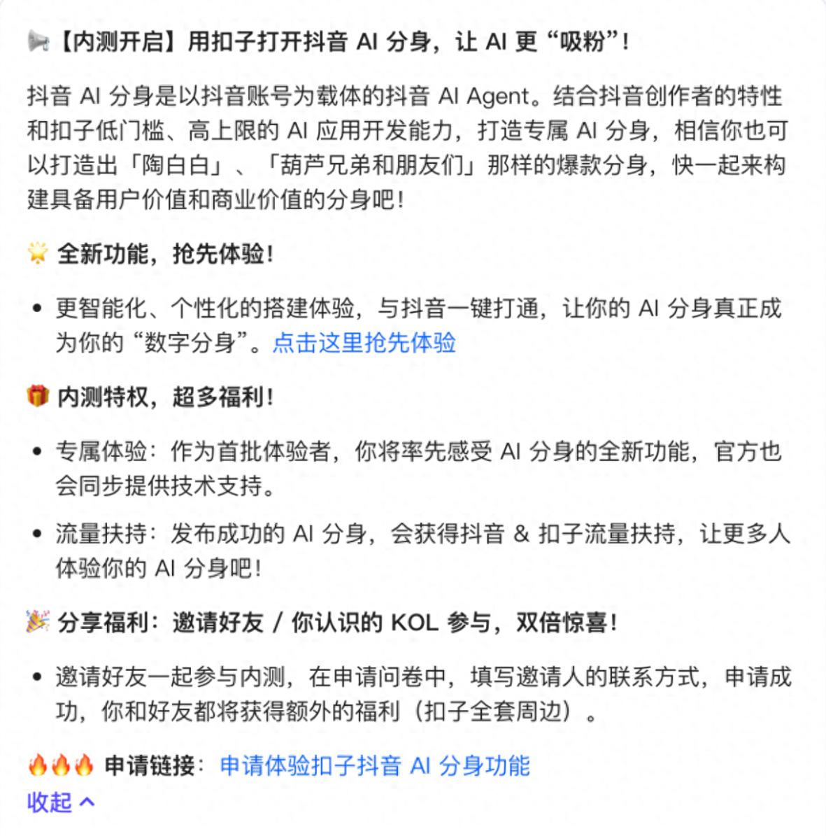 AI分身的出現(xiàn),標(biāo)志著互聯(lián)網(wǎng)平臺(tái)正從“連接人與內(nèi)容”轉(zhuǎn)向“培育數(shù)字生命體”。這場(chǎng)變革或?qū)⒋呱碌穆殬I(yè)形態(tài)——智能體訓(xùn)練師、數(shù)字形象設(shè)計(jì)師、虛擬經(jīng)紀(jì)人。當(dāng)每個(gè)人的數(shù)字分身都能創(chuàng)造價(jià)值,我們迎來(lái)的或許不僅是技術(shù)升級(jí),更是一場(chǎng)關(guān)于人類存在方式的革命。抖音的試水,只是智能體經(jīng)濟(jì)浪潮的第一朵浪花。