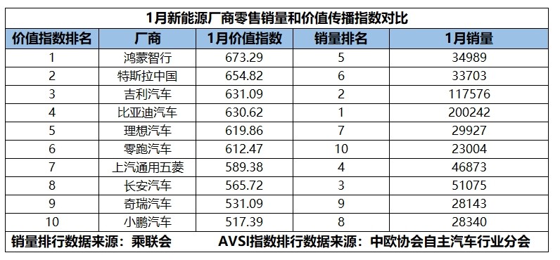 銷量之外,品牌傳播的角力同樣激烈。根據2025年1月新能源廠商價值傳播指數(AVSI)顯示,鴻蒙智行以673.29的指數登頂。其成功除了產品在設計、豪華、智能化等方面的持續熱度以外,品牌知名度與傳播度讓其首次入榜即沖到榜首,且在銷量和價值傳播指數排行中均超越了特斯拉,可見其后發優勢及合力、借力的打法頗具成效。