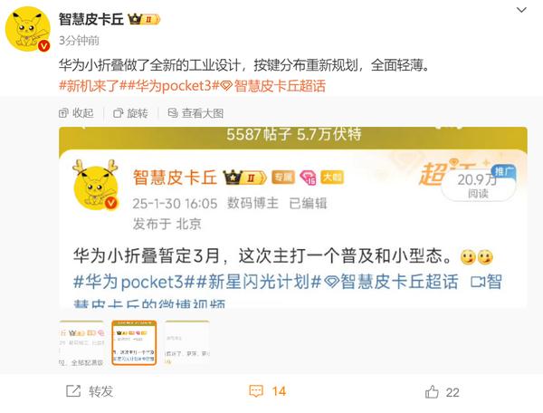 此外,還有爆料指出,華為Pocket 3將推出標準版和藝術定制版兩款機型,在設計上會更薄、更小、更輕便。