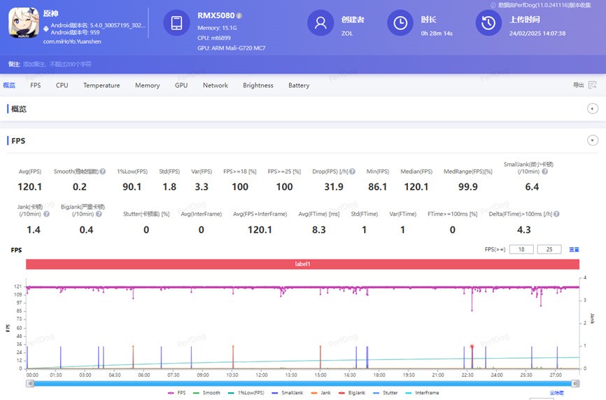 可以看到,真我Neo7 SE開啟超級幀率功能后,連續游玩30分鐘《原神》平均幀率也能穩定在120,全程滿幀操作,僅在部分戰斗場景會有微小卡頓。