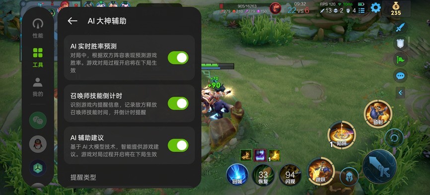 該機也支持AI大神輔助等功能,能實時對游戲勝率進行預測,幫助玩家記錄技能倒計時,亦或是智能提供游戲建議,如同有專業教練實時指導操作。