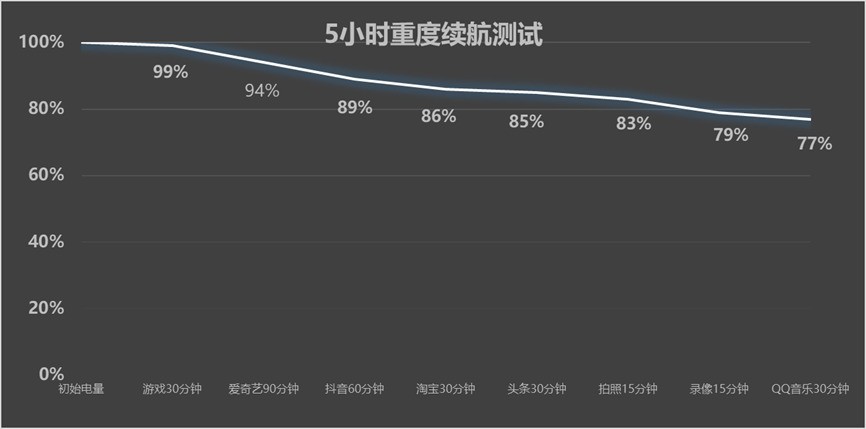 來看實際測試,我們對真我Neo7 SE進行包含游戲、視頻、拍攝等環節的5小時重度續航測試,實際結果如下圖所示: