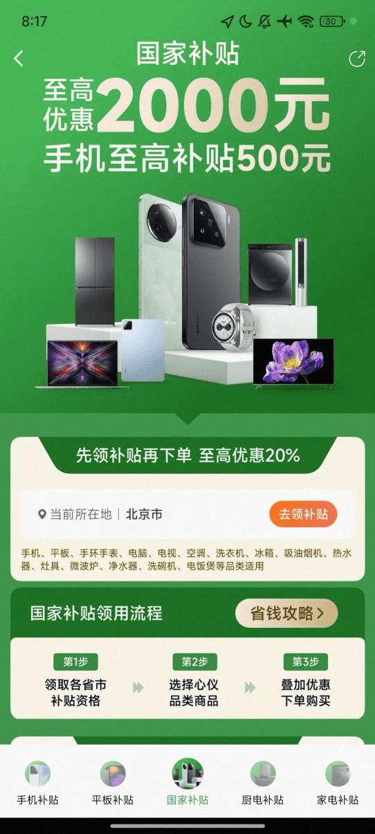 以北京地區為例,消費者需要先通過京通小程序領取補貼資格。在認證通過后,選擇“北京市設備更新和消費品以舊換新專區”,點擊手機等數碼產品購新補貼,隨后就能夠領取手機、平板和智能手表等補貼資格。然后打開小米商城App綁定資格碼。完成綁定之后選擇心儀的產品,在支付頁面就能夠使用優惠。如果消費者在門店使用,可以請店員協助操作。