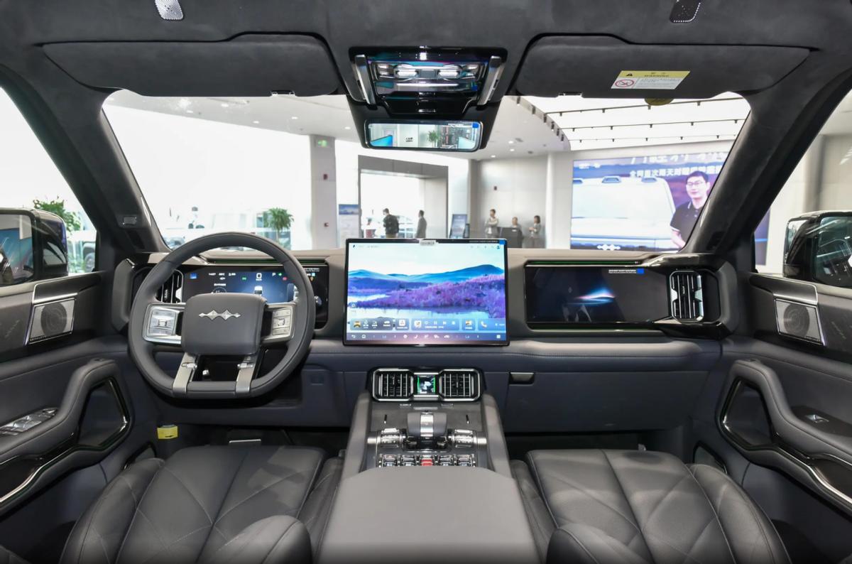 進入車內,方程豹豹8保持了家族化的座艙設計,中控臺有著較為厚重的臺面區域,并與中央扶手位置形成了T型的功能分區,臺面及門板區域均采用軟性皮質面料包覆,接合區域帶有規整的縫線處理,而在交互功能方面,前排配備了液晶儀表屏、副駕娛樂屏及懸浮中控屏,扶手區域采用了可升降的換擋把手設置,并且特意保留了豐富的實體按鍵,這也符合硬派SUV的固有元素。