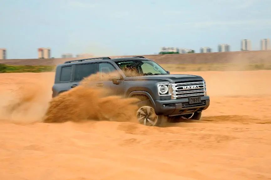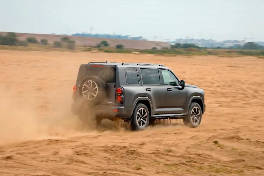 車輛原廠配備19英寸輪轂,搭配錦湖Crugen HP71輪胎,主要還是偏向于城市路面的駕駛,但盡管是原廠公路胎也不需要額外的放低胎壓,打開沙地模式,只要選擇好路線,應付河床干枯后留下的河沙路面都沒有太大問題,想炫技的話在沙地里漂移也不會出現(xiàn)四驅(qū)過熱的情況。