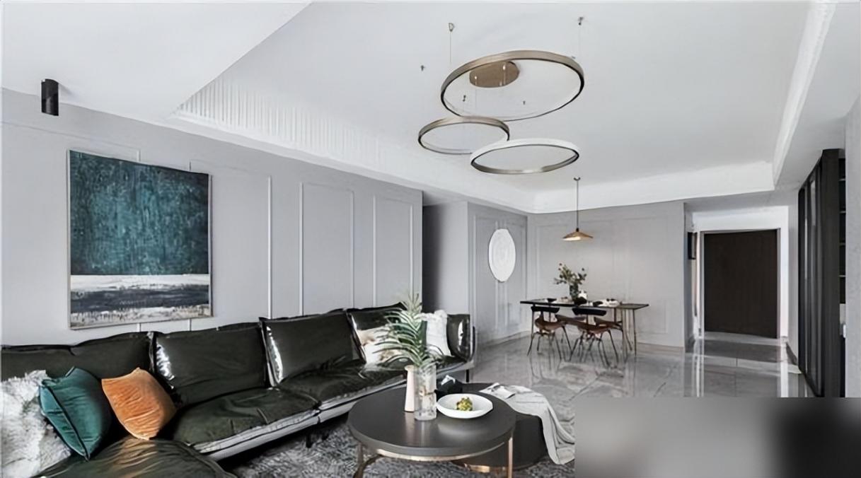 其次,餐廳和廚房之間沒有吊頂設計, 用圓形的吊燈和金色裝飾線條裝飾,呈現出一種簡約風的干練感,這種干練利索的設計風格還可以減少油煙味。