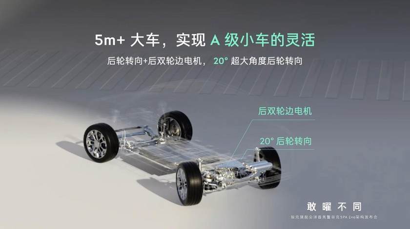 動力上,新車基于SPA Evo架構打造,搭載插電式混合動力系統,提供3種動力方案可選,包括1.5T發動機+雙電機、2.0T發動機+雙電機和2.0T+三電機(后橋雙電機配置),系統總功率最高可達630kW。而且新車還配備領克Super AI數字底盤,搭載后輪轉向系統,可以實現原地掉頭、蟹行模式等;更有CDC懸架+雙腔空氣彈簧。
