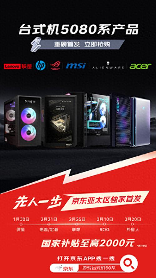 英偉達最新款GeForce RTX 50系顯卡推出后便備受期待,其中GeForce RTX 5080顯卡行業(yè)被譽為“性價比之選”,自1月30日在京東發(fā)售后,許多消費者已在京東先人一步嘗鮮購買體驗。同時,京東與聯(lián)想、惠普、ROG、微星、外星人、宏碁等品牌深度合作,在亞太區(qū)獨家首發(fā)了搭載GeForce RTX 5080顯卡的最新款臺式機重磅產(chǎn)品系列,包括微星MEG VISION X AI 幻影二代、惠普暗影精靈11、宏碁暗影騎士·煥、聯(lián)想拯救者刃9000K,以及即將首發(fā)的ROG魔霸9X和外星人Area-51等,讓前沿科技新品能更快捷地觸達廣大消費者。打開京東APP搜索“游戲臺式機50系”即可先人一步嘗鮮RTX 50系顯卡新品臺式機,還可享國家補貼立省2000元。