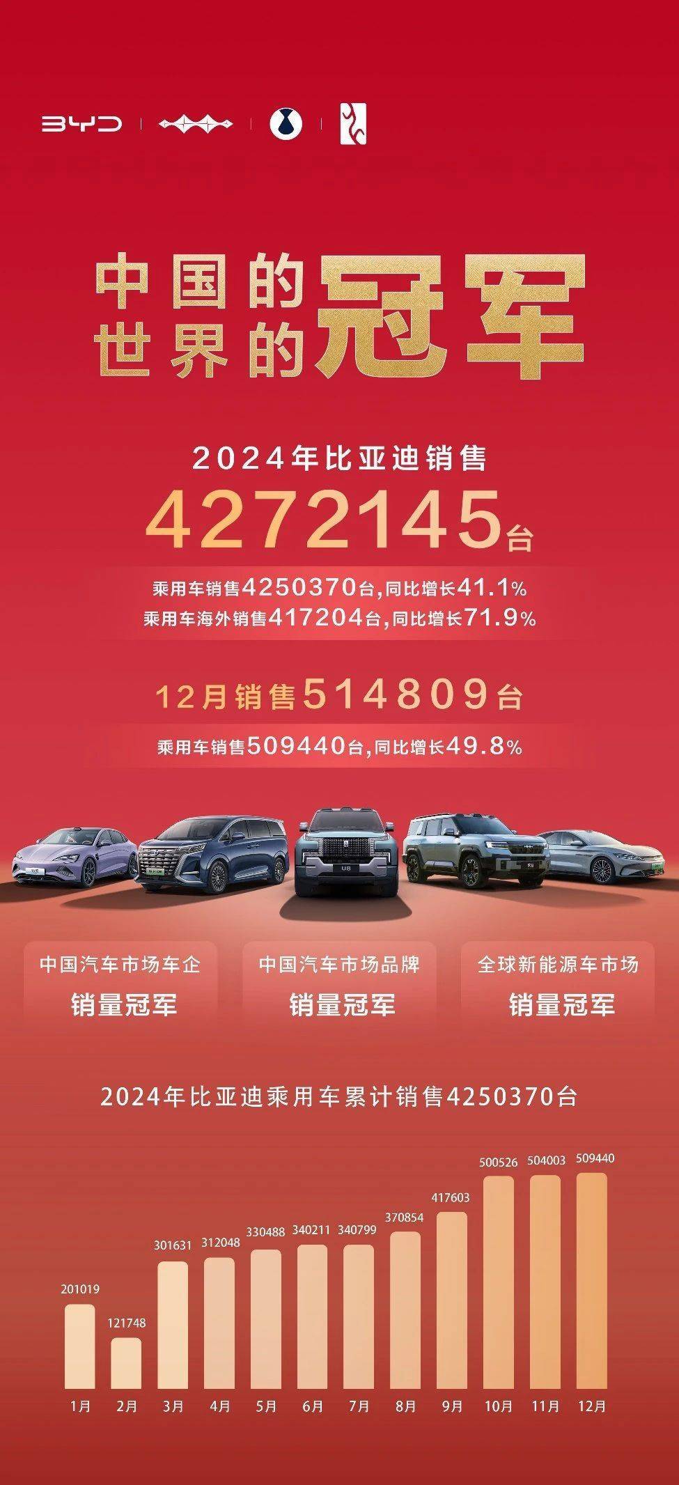 根據比亞迪發布的統計數據顯示,2024年以427萬的總銷量成為中國汽車市場車企銷售冠軍、中國汽車市場品牌銷售冠軍和全球新能源汽車市場銷售冠軍,成為名副其實的“三冠王”。