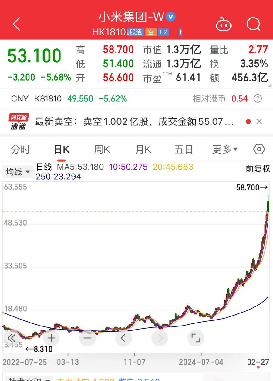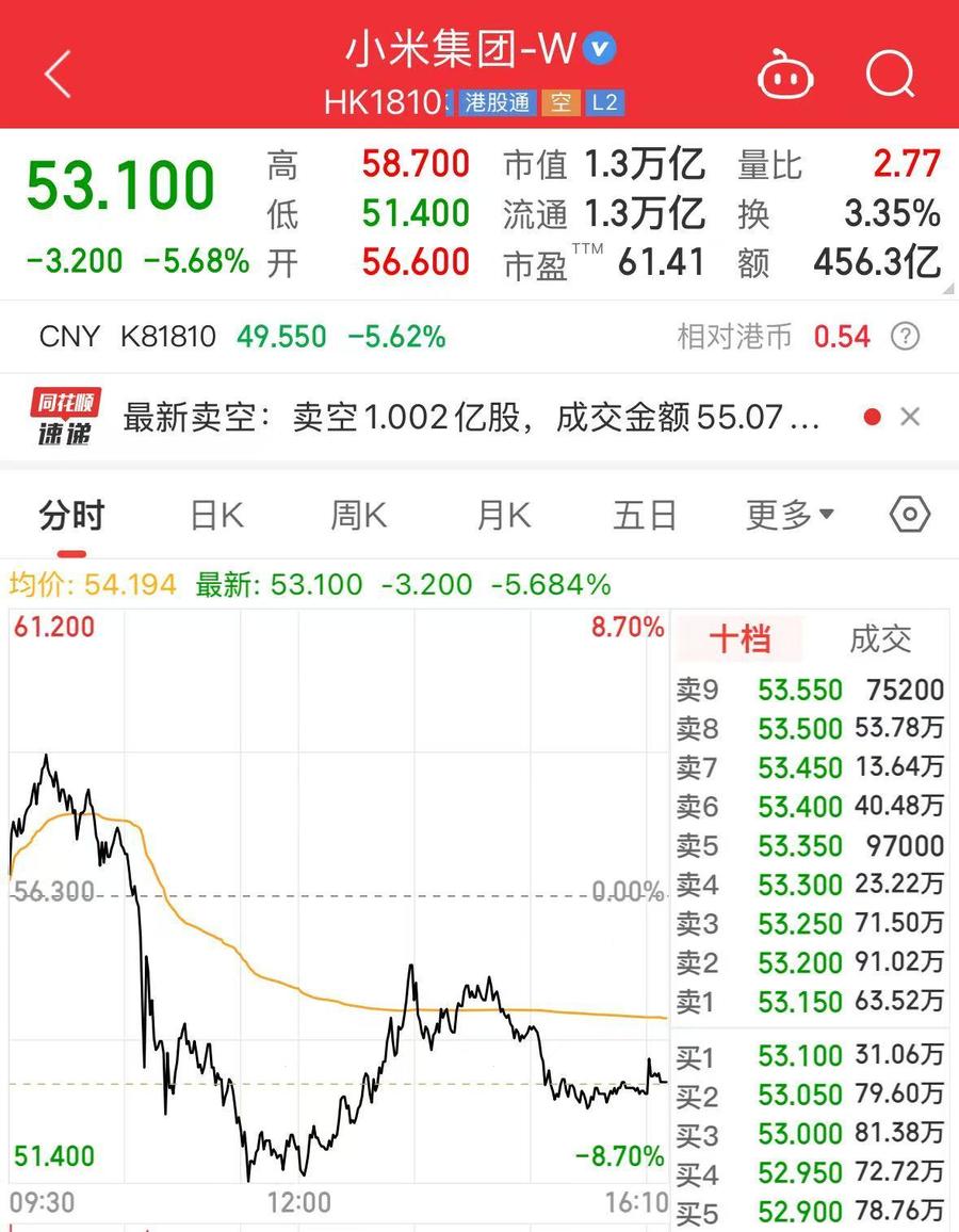 截至收盤,小米股價收跌5.68%,報53.1港元,全天振幅近13%,總成交456.32億港元。