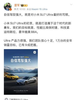 2月26日10時,雷軍再次發文,“小米SU7 Ultra的初衷,就是打造屬于這個時代的新豪車。我們的目標就是,性能比肩保時捷、科技緊追特斯拉、豪華媲美BBA。”同時,他表示,小米SU7 Ultra產品力很強,團隊信心十足,1萬輛的全年銷量目標,已有九成把握。