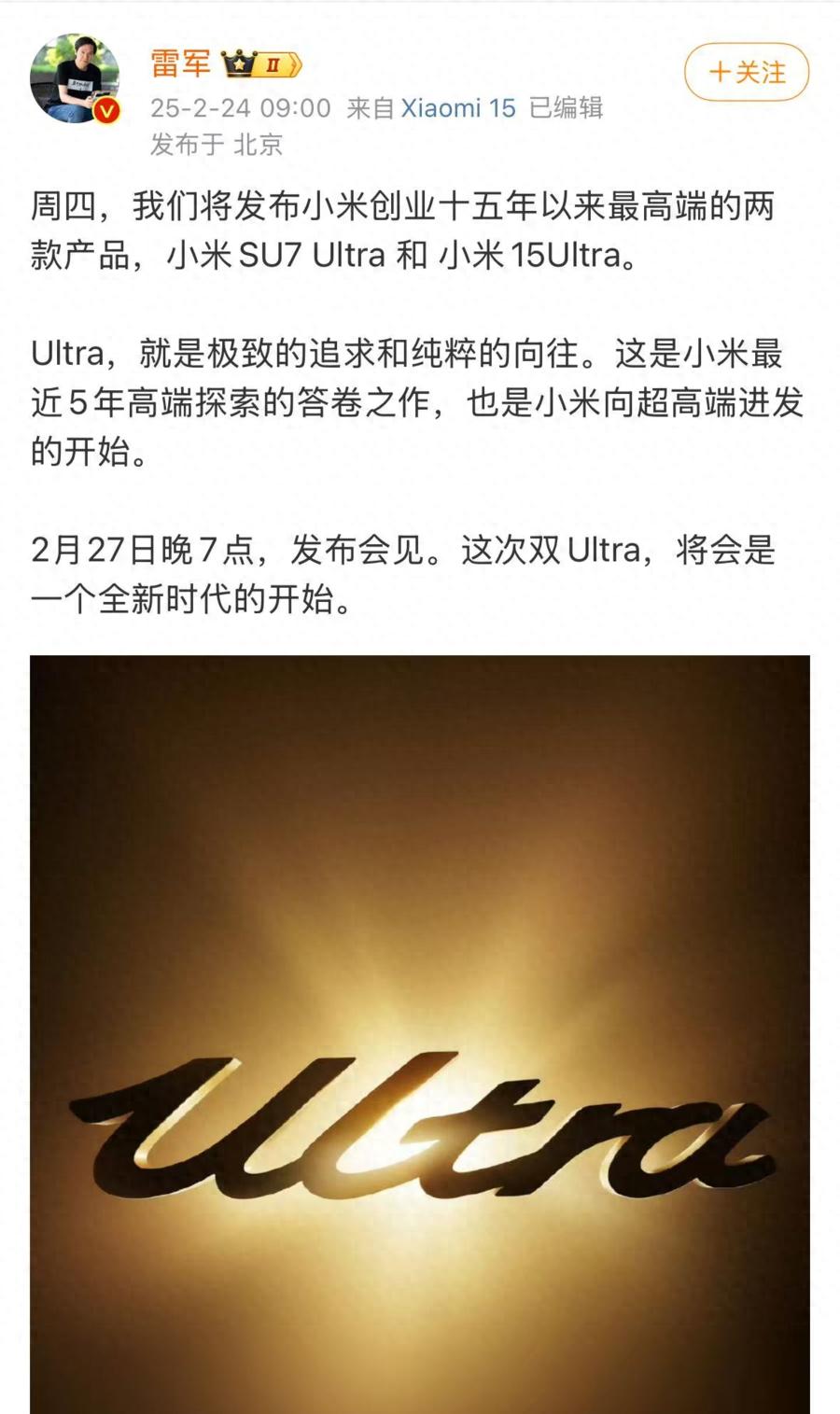 2月24日,雷軍通過微博透露,周四(27日),將發布小米創業十五年以來最高端的兩款產品。他還表示,這次雙Ultra,將會是一個全新時代的開始。
