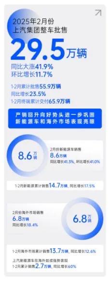 • 2月份,上汽集團整車批售量達到29.49萬輛(另有說法為29.5萬輛),同比大漲41.9%,環比增長11.7%。