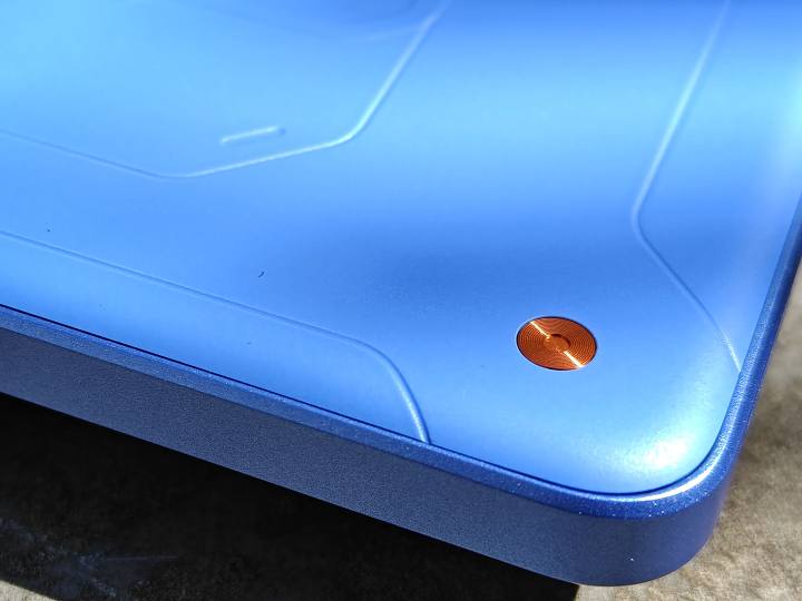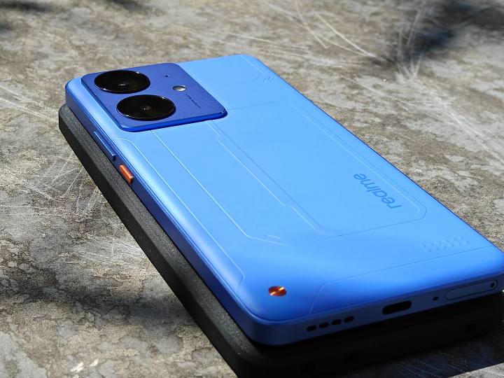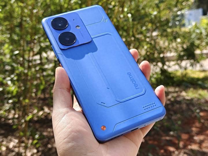 真我Neo7 SE提供了三種配色:白翼戰(zhàn)神、蒼藍機甲和暗鎧鐵騎。我們拿到的是蒼藍機甲版本,藍色涂裝+硬朗線條,背板左下角的“信念之釘”設(shè)計,瞬間讓整機有了機甲戰(zhàn)士的既視感。