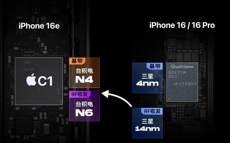 當(dāng)然更重要的是,這款手機中采用了蘋果自研的5G基帶芯片C1,這個才是蘋果的,承載著蘋果替代高通基帶芯片的最大野心。