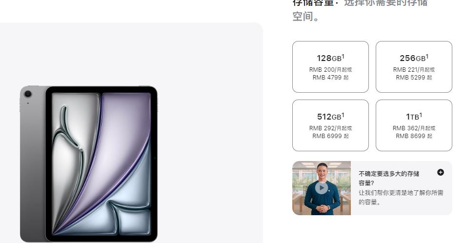 11英寸iPad Air的128GB Wi-Fi版售價4799元,而1TB Wi-Fi版售價高達(dá)8699元,1TB蜂窩網(wǎng)絡(luò)版本的價格更是高達(dá)9999元。