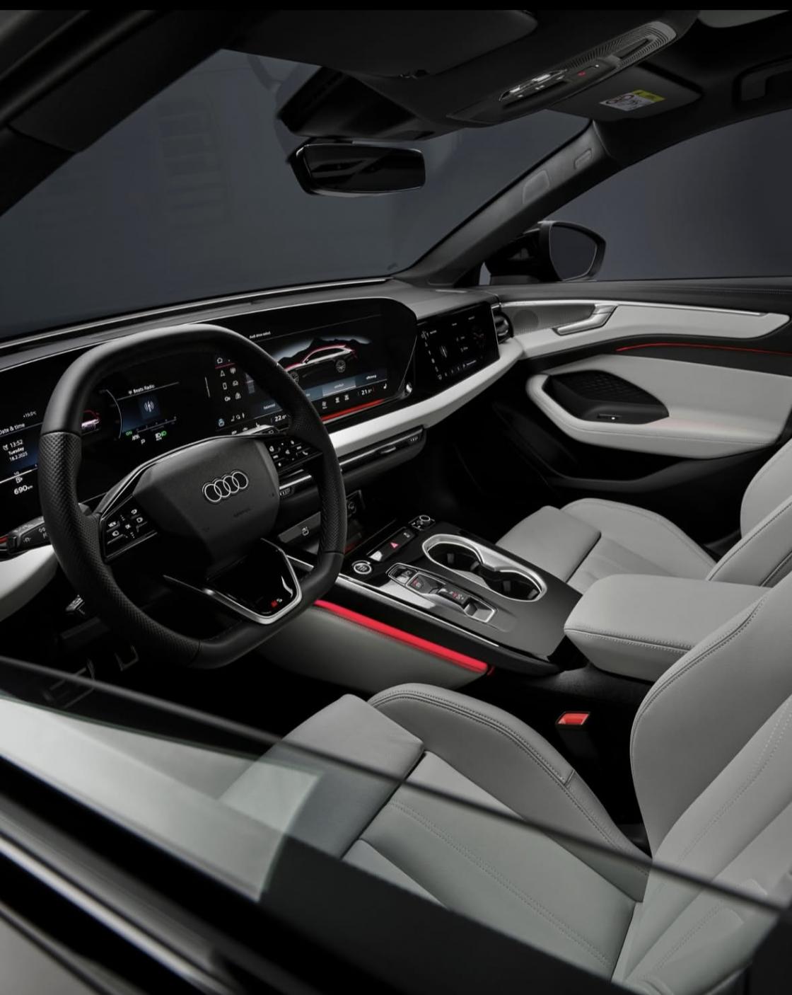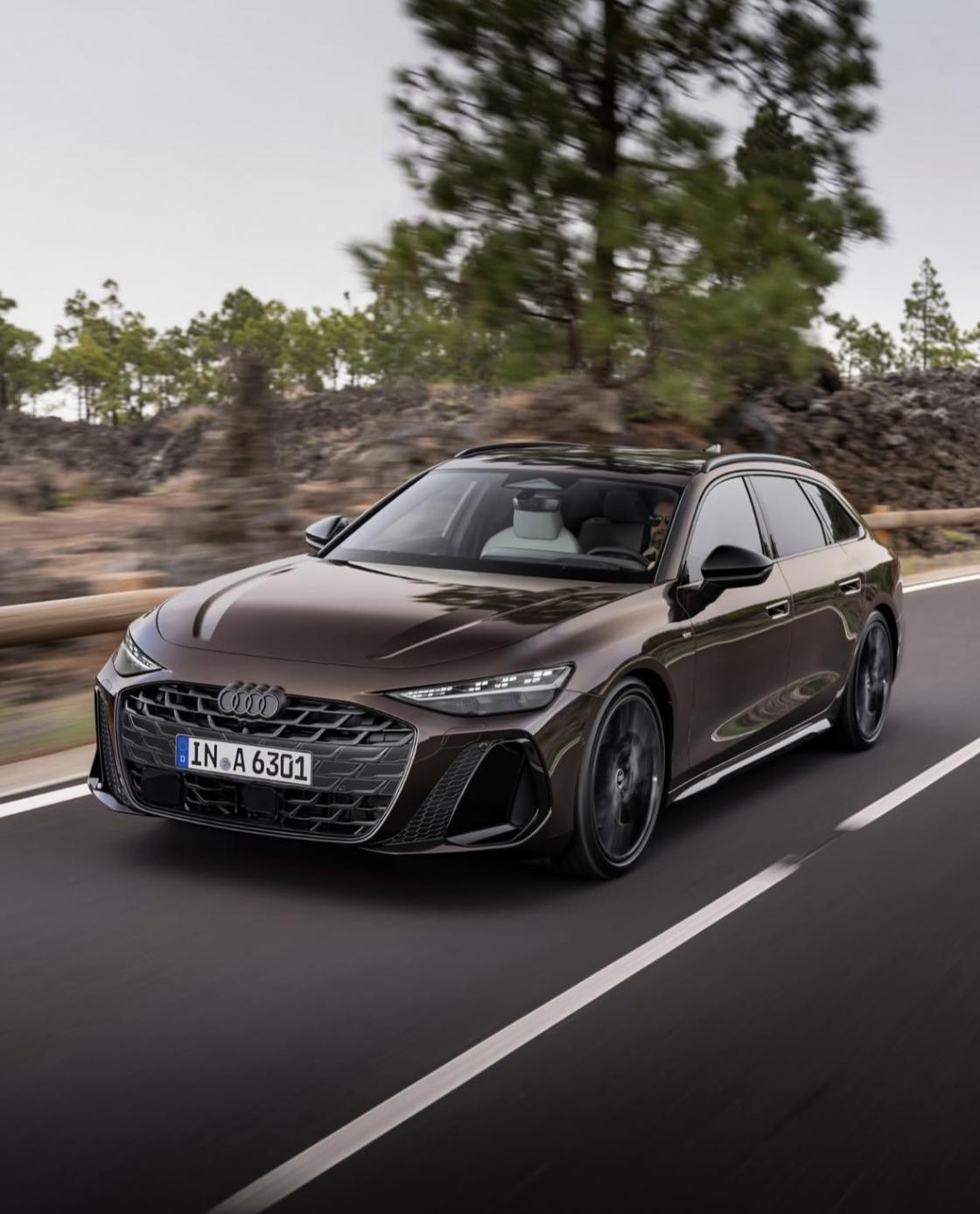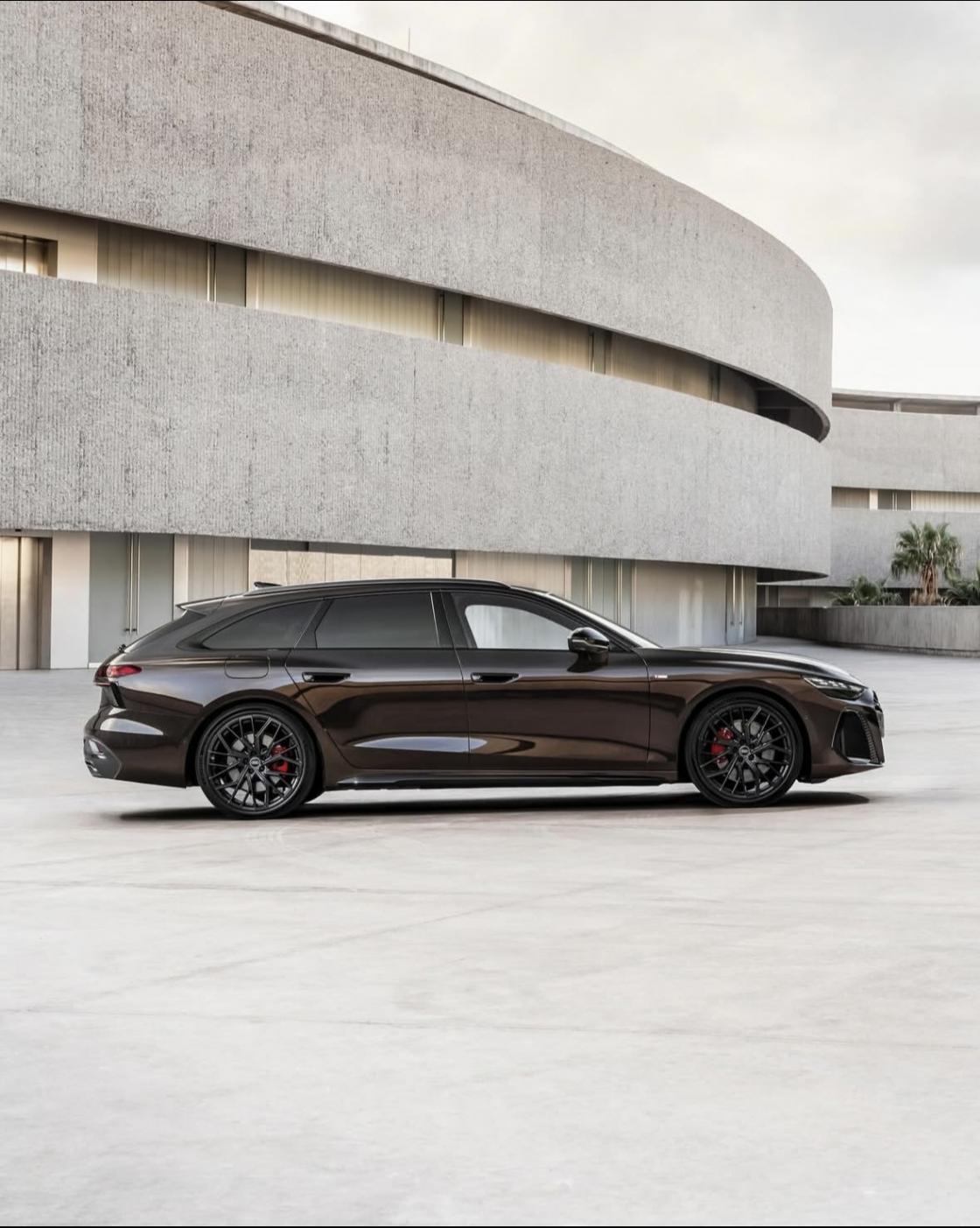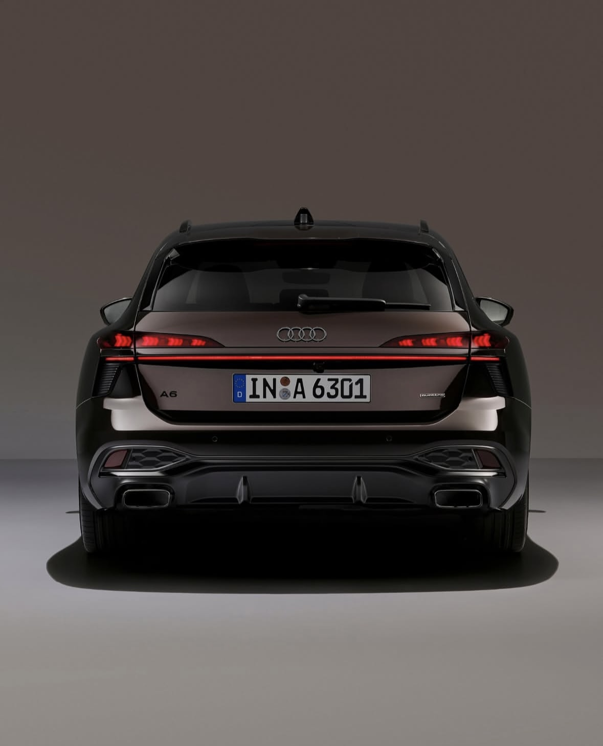 新車保留了奧迪標志性的六邊形中網,但通過黑化處理和可編程日行燈實現個性化表達,矩陣式光源支持動態圖案切換,兩側導流槽兼具空氣動力學與視覺沖擊力。側面修長線條搭配22英寸熏黑輪轂,D柱前傾角度增加至15°,風阻系數降至0.25,成為歷代最“滑”的A6旅行車。尾部貫穿式尾燈采用雙層鱗片光源,與熏黑擴散器共同演繹“西裝暴徒”美學。