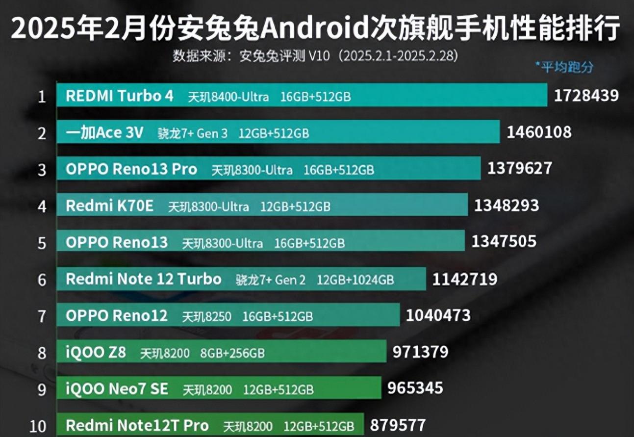 最后,在2025年2月份安兔兔安卓次旗艦手機(jī)性能排行榜中,OPPO Reno12和iQOO Z8分列第七名和第八名。在安兔兔平臺(tái)上,這兩款智能手機(jī)的平均跑分分別為1040473分和971379分。在此之后,iQOO Neo7 SE和Redmi Note12T Pro分列第九名和第十名。在安兔兔平臺(tái)上,這兩款智能手機(jī)的平均跑分分別為965345分和879577分。其中,iQOO Neo7 SE采用6.78英寸2D柔性直屏;配有電子藍(lán)、星際黑、銀河三種顏色;高度約為164.81毫米,寬度約為76.9毫米,厚度約為8.58毫米,重量約為193克。