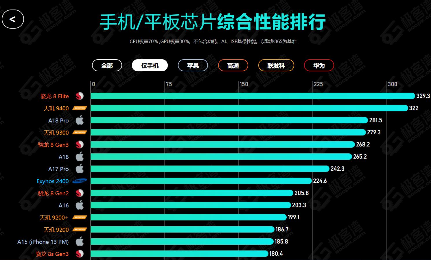 按照極客灣排名的數據來看,如今的驍龍處理器和天璣處理器也追趕上蘋果A系列處理器,新一代的驍龍8至尊版和天璣9400甚至在排名上比蘋果最新的A18處理器更高