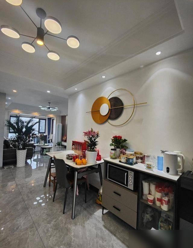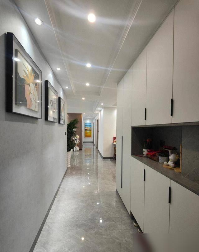 玄關(guān)處一排無拉手鞋柜,底部留空放常穿鞋,墻上掛著溫馨的裝飾畫——沒有為了“高級感”做復(fù)雜造型,卻把“每天換鞋不用彎腰”“進門能被溫暖擊中”的需求刻進了設(shè)計里。這種“實用主義”,恰好踩中了2025年裝修的核心趨勢:現(xiàn)代簡約風(fēng)強調(diào)的“隱形收納”“空間擴容”,在這兒被玩明白了——通頂柜藏起所有雜亂,墻面裝飾畫用最小成本提升氛圍感,比那些花里胡哨的“網(wǎng)紅玄關(guān)”實用十倍。