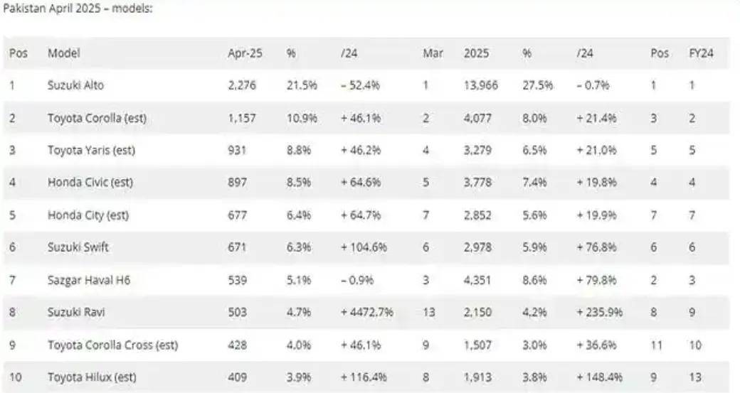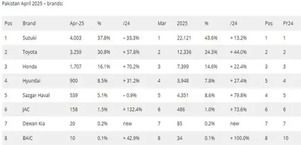 2025年4月,巴基斯坦汽車市場(chǎng)在通脹高企、貨幣貶值的陰霾下,上演了一場(chǎng)“冰火兩重天”的銷量博弈。從最新數(shù)據(jù)來(lái)看,日系品牌與本土化戰(zhàn)略的碰撞、中國(guó)品牌的穩(wěn)中求變,以及消費(fèi)者偏好悄然轉(zhuǎn)向,共同勾勒出這一市場(chǎng)的復(fù)雜圖景。