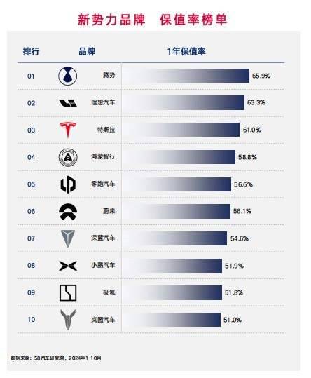 依托華為的技術支持,目前已經有四家車企與華為展開了深入合作,并且推出了問界、智界、享界和尊界四款車型,組成了鴻蒙智行聯盟,目前鴻蒙智行的1年保值率達到58.8%,排名榜單第四名,隨著目前車型數量的增多以及市占率的提升,后期鴻蒙智行的保值率還將有提升空間。