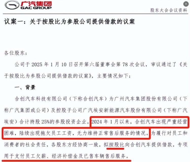不過(guò)這一次是確鑿的信息,因?yàn)槭莵?lái)自合作方廣汽集團(tuán)的披露,其表示合創(chuàng)汽車已經(jīng)經(jīng)營(yíng)困難、拖欠工資、無(wú)力維持售后。于是股東們商議,擬按照股權(quán)比例,借筆錢給合創(chuàng)汽車,值得一提的是這筆錢,只能用于支付員工欠薪、經(jīng)濟(jì)補(bǔ)償及已售車輛售后服務(wù)。此外,廣汽埃安將接管合創(chuàng)汽車產(chǎn)品的售后服務(wù)工作。