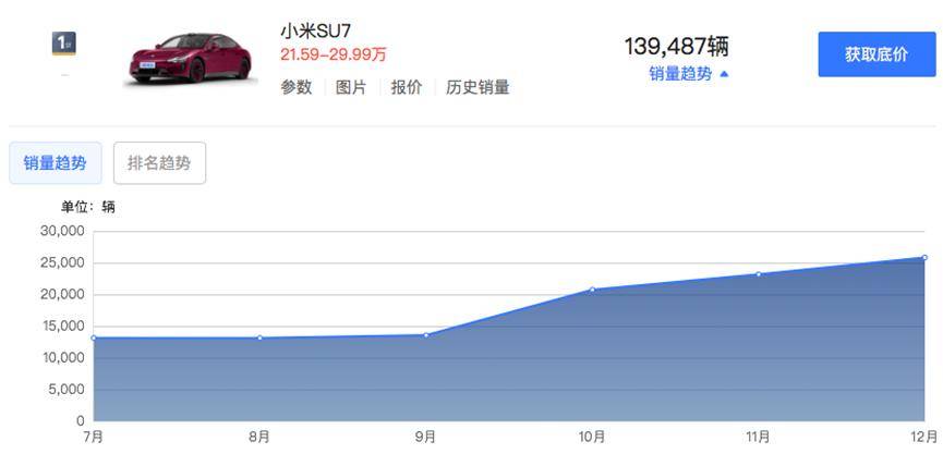回到銷量榜單,新一周的表現中,小米汽車展現出了亮眼的成績。憑借僅有的一款在售車型小米SU7,小米汽車以0.54萬輛的周銷量成功入圍榜單前三名。自2024年3 月上市以來,截至當年12月底,小米SU7累計零售銷量已達139487輛。在10月至12月這三個月期間,銷量依次為20726輛、23156輛和25815輛。作為汽車領域的全新品牌,小米SU7能取得如此成績,其市場表現堪稱強勁 。