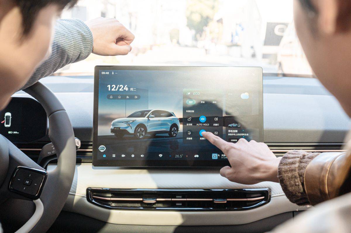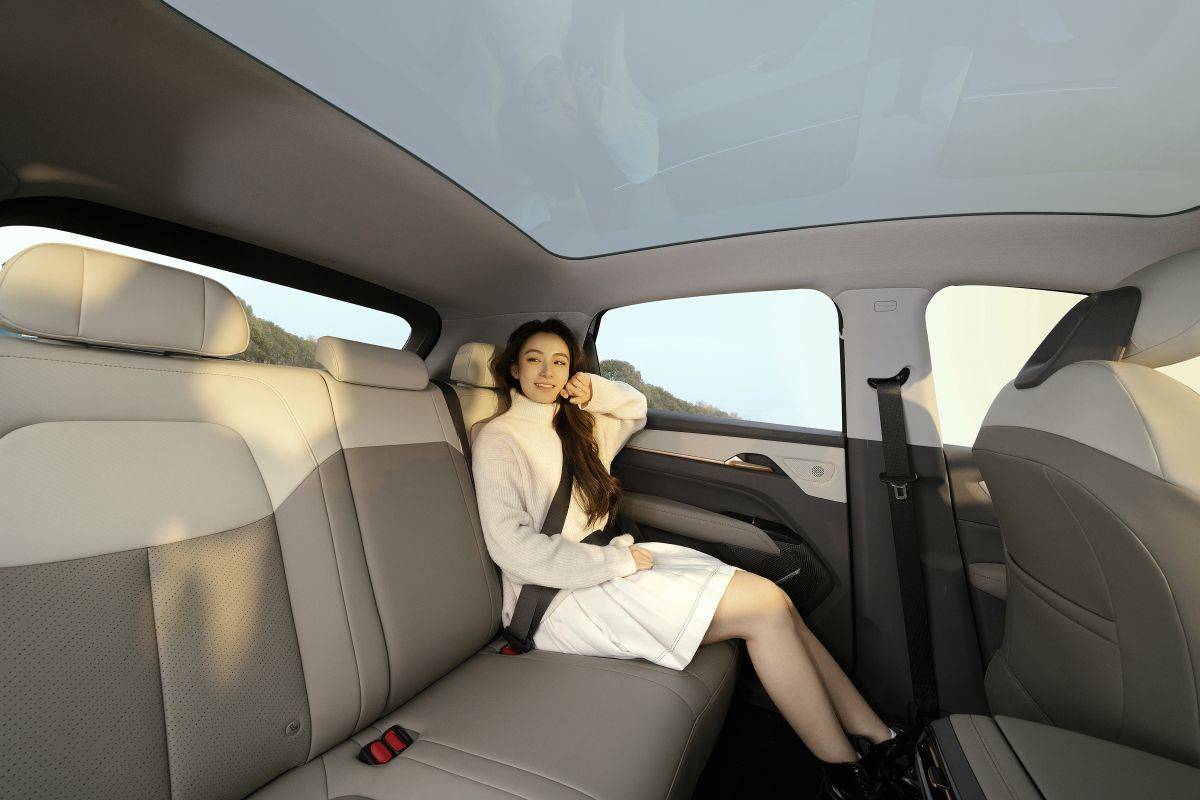 走進車內,“時空悅境”內飾設計營造出簡約、時尚、溫暖的家居氛圍。對稱式寬庭環抱座艙,層疊的型體打造出豐盈的縱橫感,讓內部空間得到最大化拓展。大量親膚材料的運用,搭配自然柔光的顏色,使人一坐進車內,就能感受到家一般的溫馨。1.2平方米的蒼穹之頂全景天幕,將天空的美景搬進車內,讓光時刻呵護用戶。14.6英寸的超薄沉浸中控屏,搭載內嵌AI大模型的智能車機系統,操作流暢,功能豐富。云舒座椅采用分區一體化造型,具有極佳的包裹感和細膩的皮紋觸感,讓人倍感舒適。