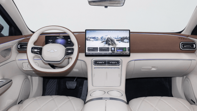 內飾部分,奇瑞風云A9中控配備15.6英寸大尺寸屏幕,門板處增加了木紋及銀色飾板,新車采用的是懷擋式換擋機構。此前,新車還配有手機無線充電面板、車載冰箱、行政沙發座椅等。