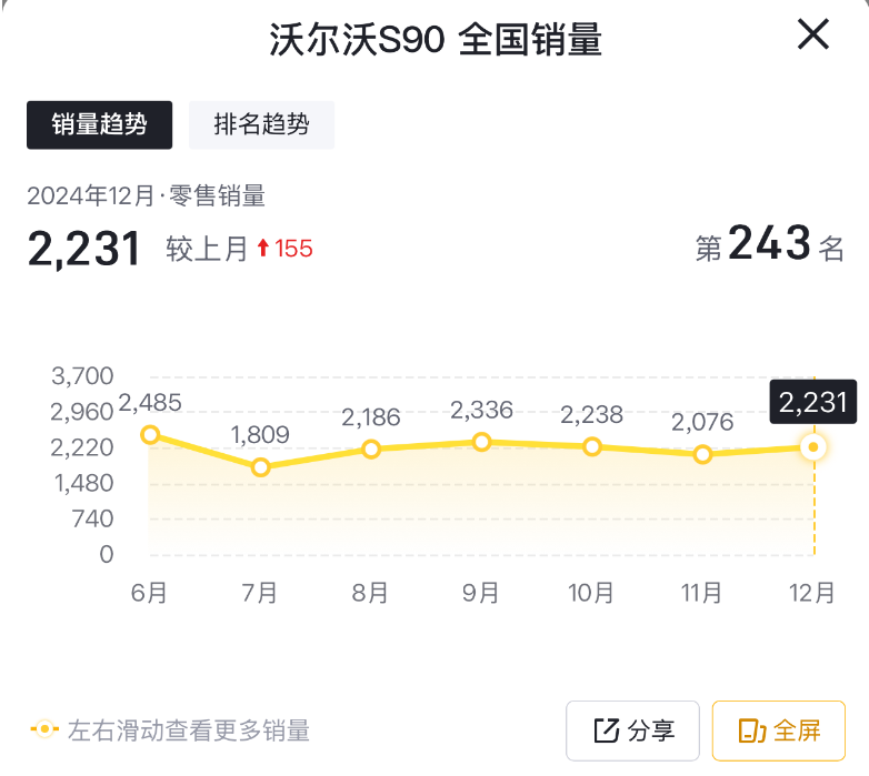 所以,從市場的角度來看,2024年12月份,沃爾沃S90的銷量呈現出環比走高的態勢,值得肯定。