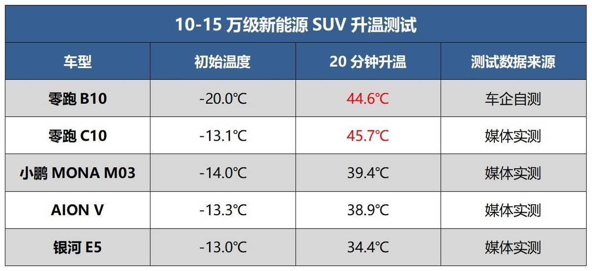 在實測中,零跑B10車內的溫度從零下15度升到26度,熱管理能耗比采用了同樣技術的特斯拉Model Y還低了25%。更值得一提的是,零跑B10的腳部溫度,可以達到38度左右的制熱上限,高出行業平均值。精細化的熱管理,還可以基于不同用車場景自動切換模式,有多達113種場景標定。既能夠有效地降低電耗,也能帶來更為舒適的乘坐感受。下面的表格是目前國內銷量比較好的緊湊級新能源SUV空調升溫測試,從實測數據來看零跑的兩臺車明顯是要好于競品車型的。