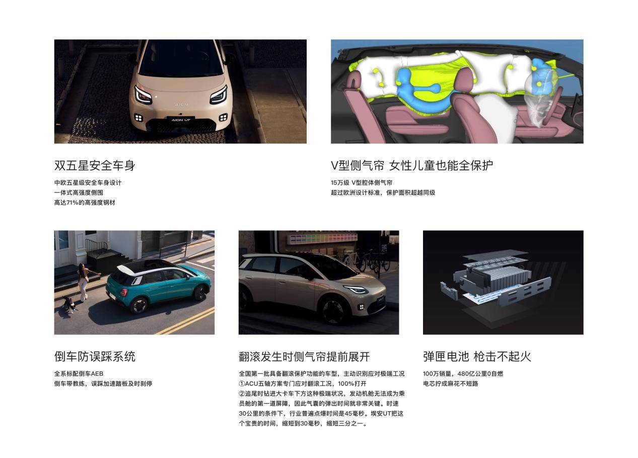 安全方面做的都挺到位,埃安UT采用中歐雙五星安全車(chē)身設(shè)計(jì),高強(qiáng)度鋼的占比超過(guò)71%,采用一體式高強(qiáng)度側(cè)圍,搭載6安全氣囊,其中側(cè)氣簾是V型樣式,保護(hù)面積更大,對(duì)女性和兒童的保護(hù)更全面,超過(guò)了歐洲的設(shè)計(jì)標(biāo)準(zhǔn),具備翻滾保護(hù)功能,主動(dòng)識(shí)別應(yīng)對(duì)極端工況,包括翻滾發(fā)生時(shí)側(cè)氣簾提前展開(kāi)以及追尾時(shí)鉆進(jìn)大貨車(chē)下方,時(shí)速30公里條件下,氣囊彈出時(shí)間縮短到30毫秒。全系標(biāo)配倒車(chē)防誤踩系統(tǒng),也就是倒車(chē)AEB,誤踩油門(mén)能及時(shí)剎停,彈匣電池槍擊不起火。主動(dòng)安全方面配備車(chē)道偏離預(yù)警、主動(dòng)剎車(chē)、前碰撞預(yù)警、道路呼叫救援等。
