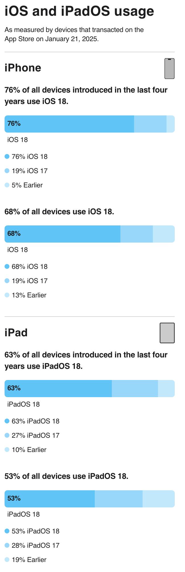 蘋果提供的 iOS 18 采用率統計顯示,iOS 18 的采用率與去年 iOS 17 的采用率相當。 在過去四年中推出的 iPhone 中,有 76% 安裝了 iOS 18,而在過去四年中推出的 iPad 中,有 63% 運行的是 iPadOS 18。所有 iPhone 中有 68% 安裝了 iOS 18,所有 iPad 中有 53% 安裝了 iPadOS 18。