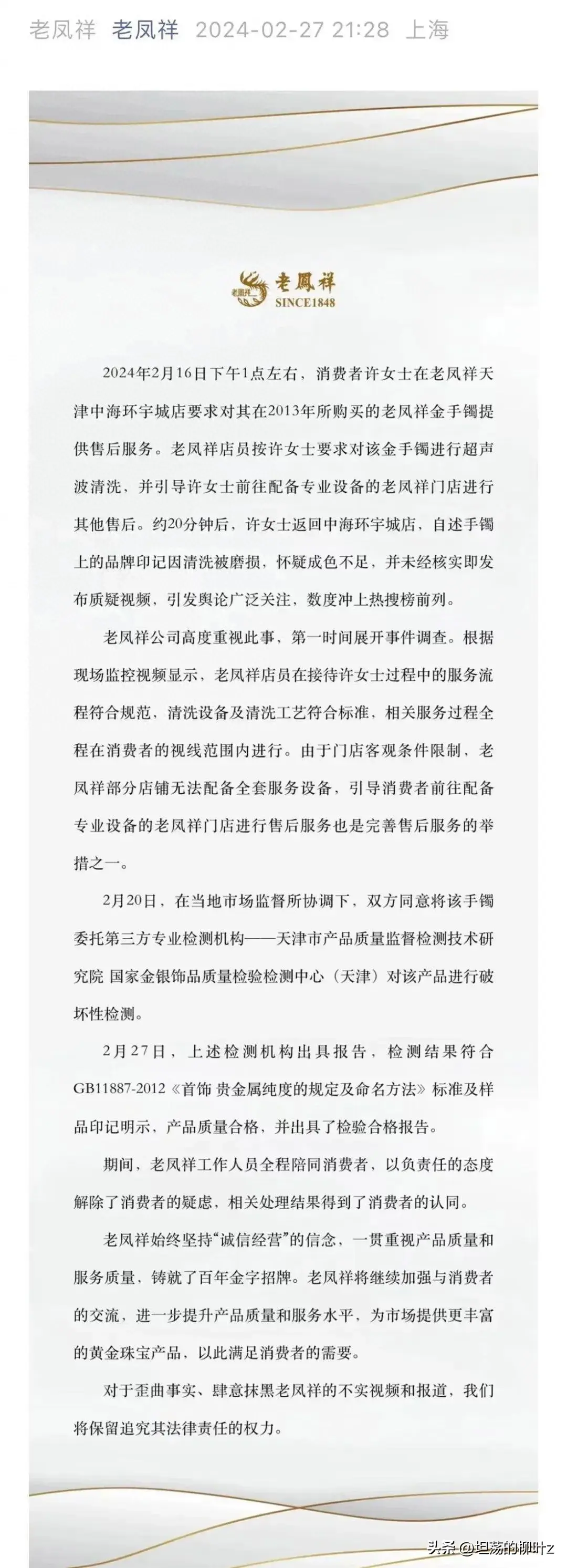 老鳳祥珠寶近日再次成為社交平臺熱議的焦點。最新消息稱,有網友發現老鳳祥某款克重產品上的logo似乎被故意蹭掉。關于這一指責,老鳳祥終于做出了回應,表示該產品經過質檢合格,并已將涉事克重產品進行置換處理。究竟是怎么回事?讓我們來看一下老鳳祥的回應。