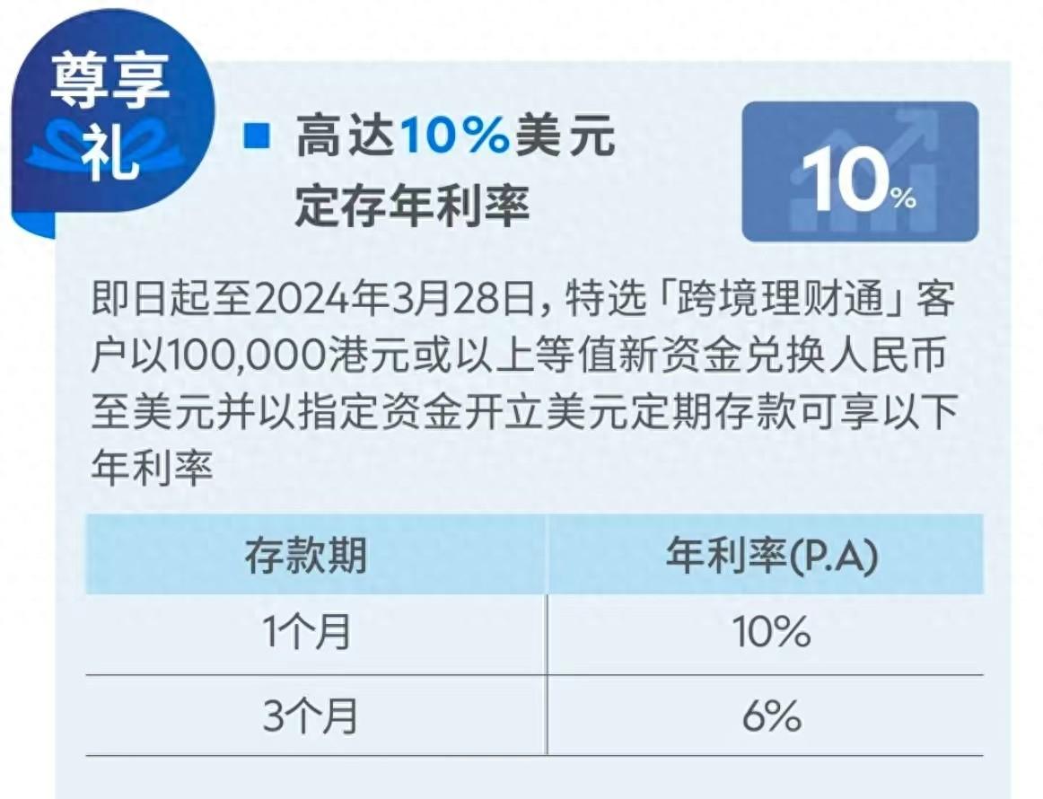 1、渣打銀行(香港)官方發(fā)布信息:即日起自2024年3月28日,特選“跨境理財通”客戶以10萬港元或以上等值新資金兌換人民幣至美元并以指定資金開立美元定期存款可享受一個月定期10%的年利率、3個月6%的年利率優(yōu)惠。