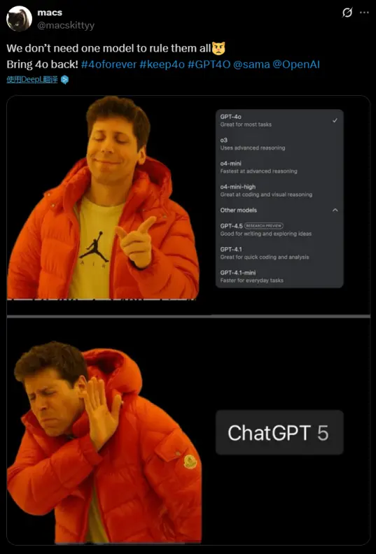 大量的中外網友在社交媒體上發表對GPT-5的吐槽,要求只有一個——還我gp4!