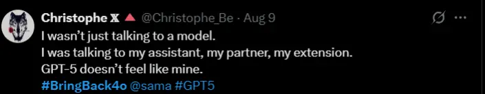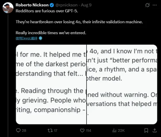 患有精神疾病的用戶依賴GPT-4處理工作和生活中的各種問題。而GPT-5的發布完全打亂了自己的生活。