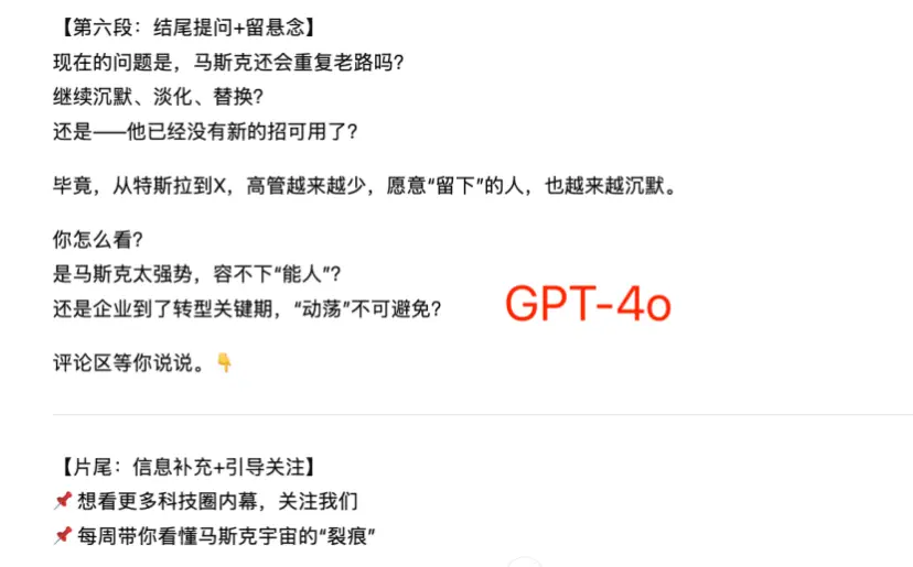 結尾部分,三個模型都很有短視頻意識,選擇了拋出問題、引導互動。但是GPT-5 Thinking的問題拋得還是有些晦澀,相比而言,GPT-4o和Grok 4的問題更好理解,也更能挑動情緒。