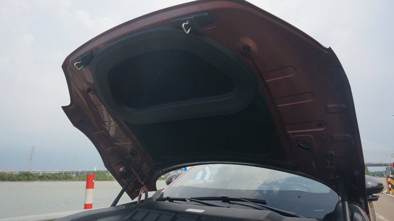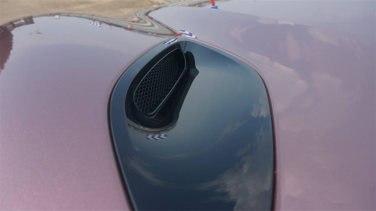 整個頭燈被分為上下兩部分,下半部分才是真正的前照燈組,而上半部分則是LED日行燈,采用了完全鏤空的造型,立體感一下強化了很多。而前機蓋上還帶有一對朝向后方的通風道,結合對前機艙的觀察,氣流可能是從燈組上沿流入,在前機蓋下方流通后,從機蓋頂部流出。有興趣、有條件的朋友們可以研究下。