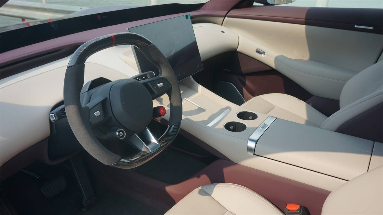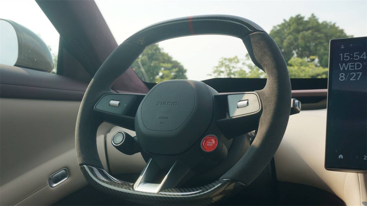 方向盤保持了SU7的造型基礎,同時細節上也有了更多變化。六邊形的氣囊罩蓋變得更簡潔。控制巡航功能和駕駛模式的獨立控件也被保留了下來,甚至彈射模式的按鍵直接變成了更抓眼球的全紅色樣式。不過方向盤左右兩側的控件樣式進行了簡化,包括滾輪和左右按鍵都變得更簡單了,運動感沒有SU7上那么強烈了。
