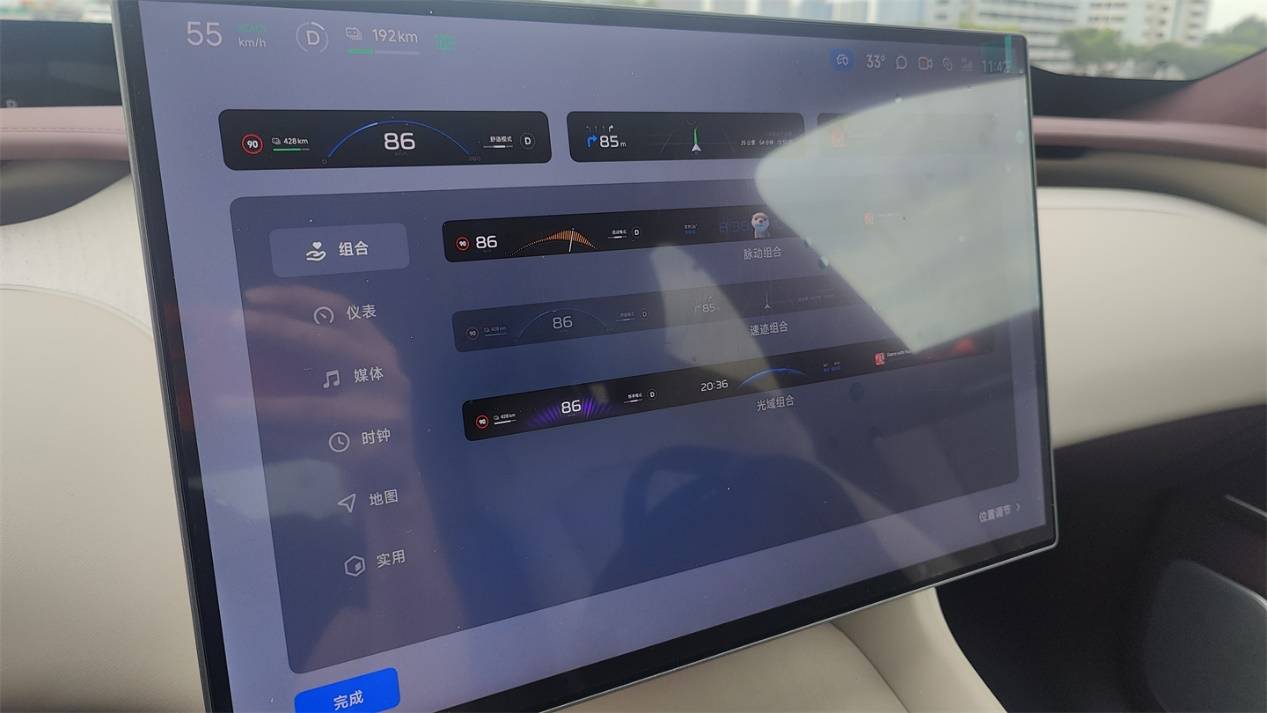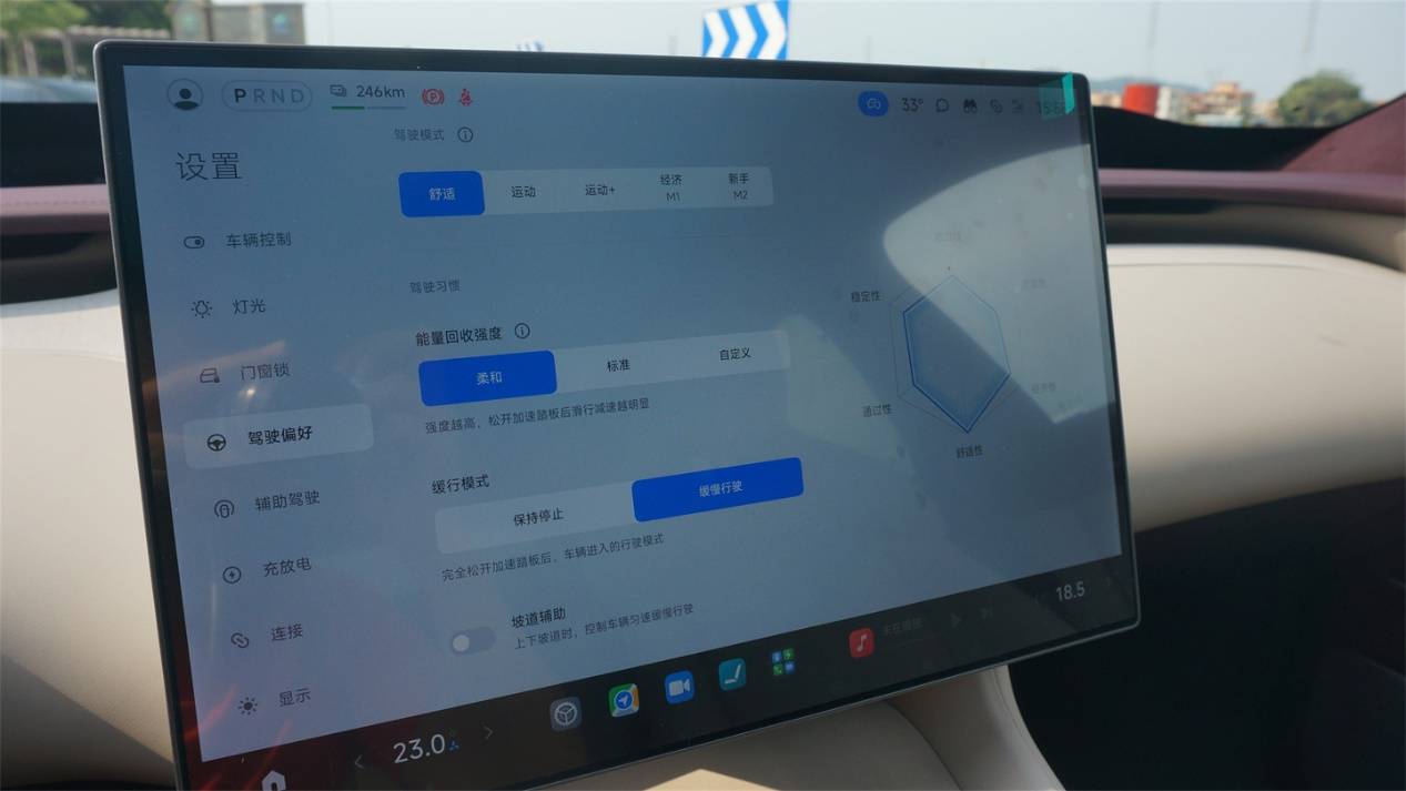 動能回收默認只提供了兩個檔位、以及一個自定義檔位,差異性會有點大,個人推薦柔和狀態,能夠提供接近于燃油車丟開油門之后非常微弱的減速感,開起來更舒服自然;標準模式下雖然接入的頓挫感有所減弱,但是減速度比較大,有很明顯的拉扯感,平時用容易暈車。