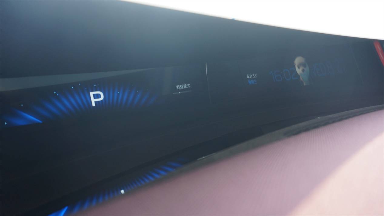 取代SU7上更類似于噱頭的翻轉屏,這條長長的“天際屏”P-HUD,成為了YU7上含金量比較高的技術亮點之一。實際上它的原理很簡單,就是通過三塊拼接的屏幕播放HUD的影像,然后投影到前風擋下方加長加粗的黑色部分,再反射入人眼成像。在特定的角度下,你甚至可以看到三塊小屏幕中間的分界線。